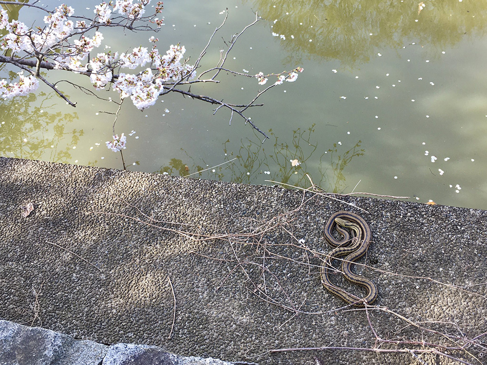 ![]() 甲羅に桜の花をのせた亀と花筏 |